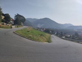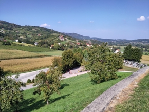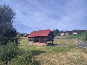 Quelques grands coucous plus tard, nous sommes au pied de la petite côte qui nous attend ce matin. La route nous entraîne dans une campagne vallonnée entre champs, prés et bois. Les demeures sont belles d’une ruralité simple. Les fameux kozolec sont ouvragés et bien entretenus.