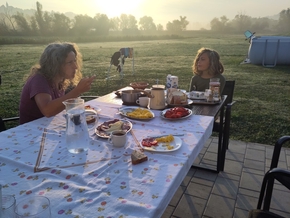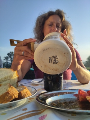 Petit déj royal ce matin. Anka et Boni nous soignent. Boni veut même nous faire goûter son schnaps au miel. Ok, on aime bien le schnaps, mais au réveil, on n’est pas habitué. On y trempera quand même les lèvres, il est excellent.