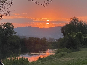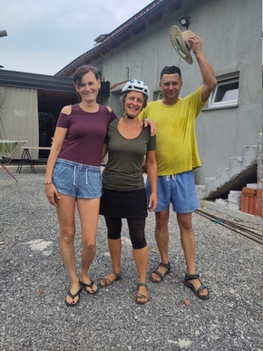 La pause de midi se fait auprès du chateau de Grad Otočec assis sur son île et nous arrivons à Novo Mesto en fin d’après-midi. Nous trouvons un petit coin pour bivouaquer en bord de rivière à côté d’un café ouvert le week-end et ce n’est pas le week-end. C’est un endroit d’où partent quelques habitués pour nager en fin de journée. Marc et Alban discutent avec un historien après sa baignade. Il parlent des aspects plus sombres de l’histoire de la Slovénie, notamment depuis la seconde guerre mondiale. Beaucoup de morts oubliés et une utilisation plutôt délétère du droit.