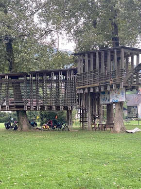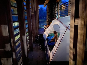 La tente dans la cabane nous a permis de rester au sec. Plus rapide de plier, pas besoin de faire sécher.