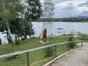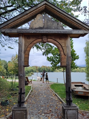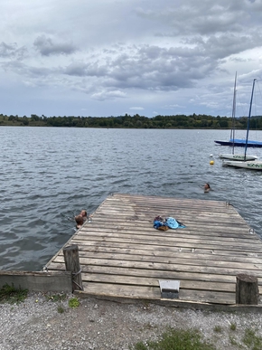 Notre pause déjeuner est agrémentée de quelques parts d’un délicieux strudl et d’un excellent jus de pomme apportés par la propriétaire de la maison à côté de laquelle nous nous arrêtons. Nous ne sommes plus qu’à quelques kilomètres de notre but, nous l’atteignons rapidement et nous précipitons dans le lac de Kočevje avec délice.