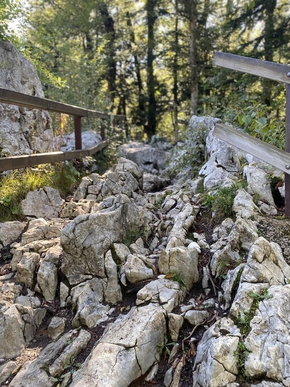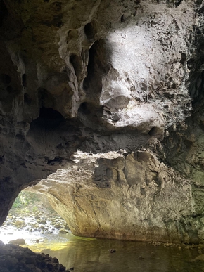 Nous empruntons le sentier et débouchons sur le “petit” pont naturel (Mali naravni most). C’est extraordinaire. Nous suivons un sentier qui descend au niveau de la rivière, 40 mètres plus bas et nous permet d’évoluer dans les cavités où elle circule. Nous sommes tellement bouches bées que ça finit par faire bouches cées (désolé pour tous les amis qui traduisent le blog avec un traducteur automatique, ce jeu de mot, médiocre au demeurant, ne pourra pas être traduit par un robot).