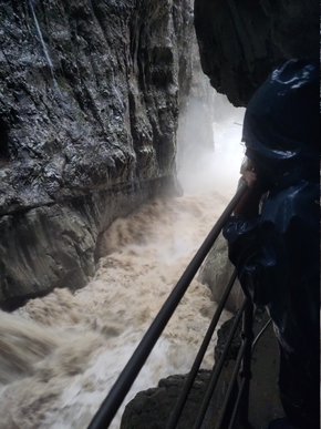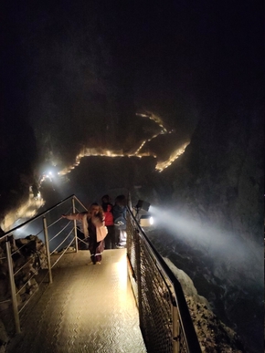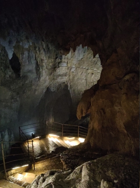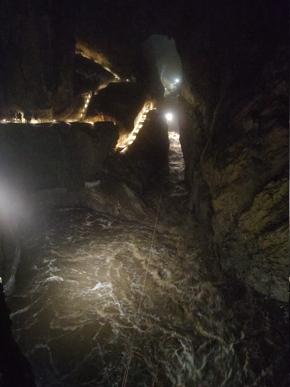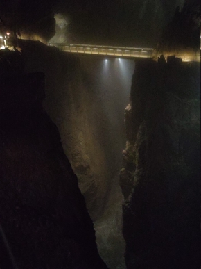 Arrivés en milieu de visite, elle nous explique cependant que tout ce que l’on vient de voir n’est pas ce pourquoi la grotte est classée au patrimoine mondial de l’UNESCO. Nous arrivons en effet au niveau du plus grand canyon souterrain d’Europe où rugit une rivière déchaînée.