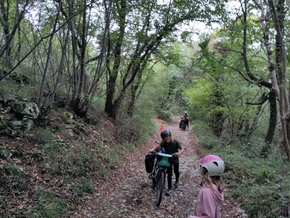 Nous reprenons la route, qui nous emmène vers une petite route, qui nous emmène vers une rue, qui nous emmène vers un chemin. Et ce chemin est bien caillouteux. Et il grimpe ! Impossible de rouler sur nos selles, nous poussons. Pas simple. Mais nous finissons par retrouver un revêtement plus compatible avec nos montures.