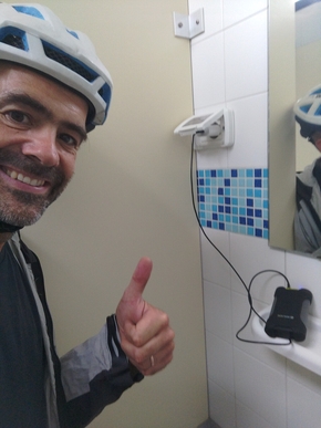 Nous nous apprêtons à préparer le repas lorsque, patatras ! Je me rends compte que j’ai oublié la powerbank au camping ! Tartiflette et pomme de pin ! On aurait oublié une casquette ou un chouchou, je n’aurais peut-être pas fait l’aller-retour, mais là, impossible de faire l’impasse. Ce que nous appelons powerbank est une batterie qui nous permet de charger nos téléphones, la tablette ou les lumières. Nous pouvons la charger avec notre panneau solaire ou en la branchant sur le secteur. C’est un élément indispensable de notre voyage et je l’ai branché dans les sanitaires du camping.