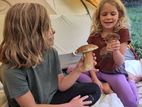 Depuis que je suis dans ce pré à monter la tente, je n’attends qu’une chose, c’est d’aller me balader dans les bois pour chercher des champignons. Le boulot paternel terminé, les enfants m’accompagnent pour une balade mycophile. Nous croisons quelques champignons mais ne les ramassons pas. Trop peu nombreux, non-comestibles ou non connus, mais quel plaisir de se promener avec les enfants.
