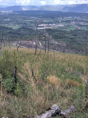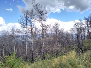 Nous approchons d’une forêt étrange, de loin, tous les arbres semblent morts. De près nous nous rendons compte que la forêt a brûlé. Peut-être l’an dernier ou l’année d’avant. En tout cas la vie est bien là qui explose entre les troncs calcinés.