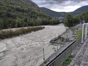 C’est une route plate qui nous amène à Nova Gorica et malgré les travaux nous barrant la route, nous parvenons à atteindre la fameuse rivière Soča. Nous en entendons parler depuis que nous sommes en Slovénie. Il paraît qu’elle a une couleur incroyable, turquoise. Mais présentement, elles est couleur boue car un énorme orage a éclaté plus haut et nous fond dessus… quelques minutes après que nous sommes assis au café bordant la rivière. Pas fâchés d’être à l’abris, ça décoiffe.