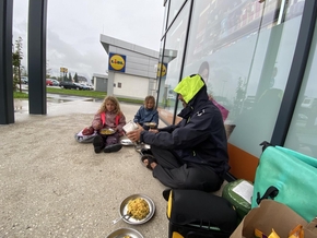 Cette pause nous permettra de montrer à tout le monde comment fait la famille Loyat pour se préparer à manger durant son voyage. C’est amusant de préparer le repas à même le sol avec un réchaud à essence dans une zone commerciale entre macdo et lidl. Ce n’est pas forcément l’endroit que j’affectionne le plus, mais nous aurons au moins récolté quelques sourires.