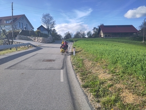 Cela signifie changer d’itinéraire et trouver le bon. Selon les données cartographiques ça va bien monter mais c’est gérable. Les enfants sont fous de joie de retrouver nos amis, mais Léon est encore fatigué et nous reprenons la technique du convoi exceptionnel à coup de chambre à air.