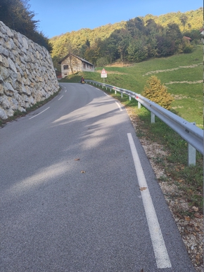 Nous arrivons au pied du col et les panneaux nous annoncent du 15% ! Pardon ? Mais en calculant avec mon appli, j’arrivai à du 8% ! La théorie n’est pas toujours à la hauteur de la réalité. Et de la hauteur nous en prenons un paquet. Cette côte n’en finit pas, nous poussons les vélos à pieds.
