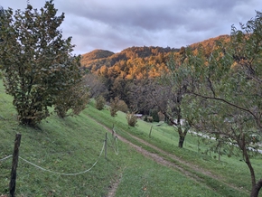 Nous plongeons vers la chartreuse de Žiče. Impossible d’y dormir. Nous devons pousser un peu plus. Nous avançons et apercevons un cimetière. Parfait pour remplir les gourdes. Un vieil homme coupe les pieds de maïs à la main dans un champs. Je lui demande si nous pouvons poser la tente à côté avec mes deux mots de slovène et force signes des mains. Il nous invite chez lui. Reprend son tracteur et nous guide. Il y aura un toit sous lequel nous pourrons poser notre tente.