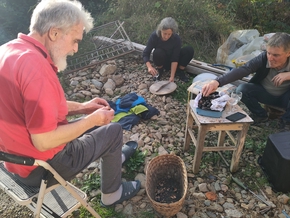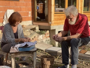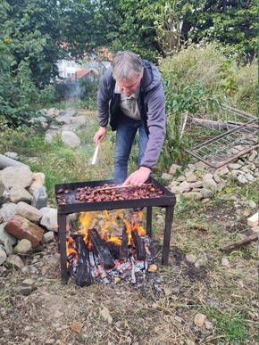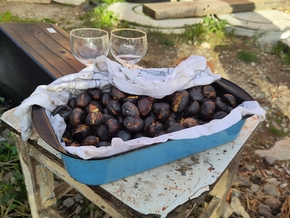 Cet après-midi, Drago, un ami que nous avions déjà rencontré la dernière fois, vient avec des châtaignes. Il allume un feu dehors, met en place son brasero et les cuit à la perfection. Nous nous régalons, tout simplement. Il fait beau, je sors le ukulélé et nous chantons. Voilà une belle après-midi d’automne comme on les aime.