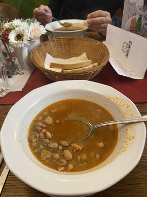 Trois quarts de la famille a du mal à imaginer manger dehors, même si j’ai trouvé un abris. Nous sommes fatigués. Manifestement, arriver dans un nouveau pays nous épuise. Nous décidons de manger au chaud et au sec dans l’auberge à côté. Oh la bonne idée. Le goulash et la galette de pommes de terre comme plats du jour nous rassasient et nous régalent. Le tout pour moins de 20€ pour 4.