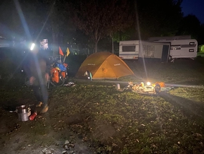La route monte, mais la pente est douce. Puis elle descend et nous dépose juste avant le coucher du soleil dans une grande plaine enherbée. Il s’agit d’un parc naturel, nous indique un panneau, mais les foins ont clairement été faits dernièrement à l’endroit où nous posons la tente au calme ce soir.