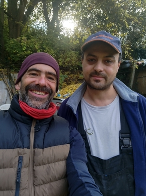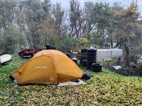 Alors que nous avançons sur un chemin cabossé avec une visibilité très restreinte, sans comprendre vraiment où nous roulons, nous tombons face à face avec 2 messieurs. Gergő et son père Jozsef nous déconseillent de dormir au bord de l’eau car là où nous nous trouvons, il y a moins d’un mois, ils étaient sous l’eau. Ils nous proposent de dormir dans un espace plus haut à l’extérieur de chez eux et nous aident à monter les vélos afin d’être juste au-dessus du niveau de la dernière crue. Ils se démènent pour nous installer la lumière, l’électricité et même des toilettes ! Un peu plus tard dans la soirée ils viendront nous apporter une spécialité achetée juste pour nous quelques minutes plus tôt, un Kürtőskalács. Cette spécialité semble être plus d’origine Transylvanienne mais est très présente en Hongrie.