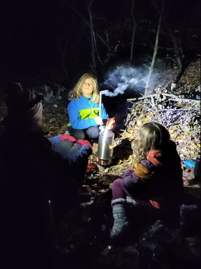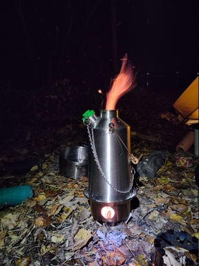 Ce campement est aussi idéal pour tester notre nouveau jouet : le réchaud à bois. Estelle nous en parle depuis le début du voyage et c’est vrai que c’est formidable. Quand bien même le foyer est tout petit, le feu agit sur nous comme un aimant sur la limaille. Il permet de chauffer l’eau très rapidement grâce à la bouilloire qui sert également de cheminée. Nous sacrifions le cul de notre poêle qui devra désormais dormir entourée de papier journal avant de rejoindre son sac habituel… Mais c’est bien pratique de pouvoir faire revenir les légumes dans la poêle pendant que les reste cuit dans la casserole qui se trouve sur le réchaud à essence.