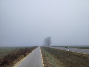 Ce matin le thermomètre indique -3 degrés. Lorsque nous prenons la route une neige microscopique tombe. Nous sommes tous heureux ! Cette soirée chez Zoltan et Eva nous a fait grand bien et ils nous ont chouchoutés.
