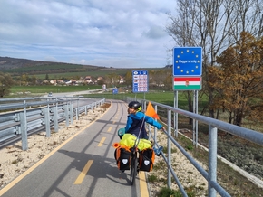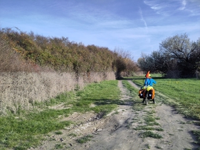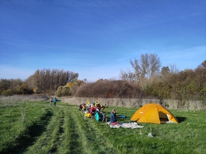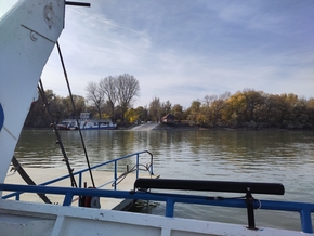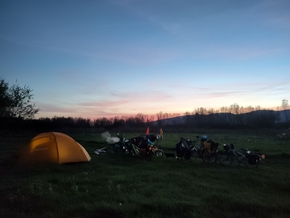 Puis vient l’heure de traverser le Danube. Nous montons dans le bac pour rejoindre l’île en face. Après quelques zig-zags, nous finissons par nous faire indiquer un coin de rêve pour bivouaquer. À quelques mètres du Danube, une grande prairie en herbe. Des vaches ont laissé quelques traces de leur passage, mais il n’y a pas de clôture ici.