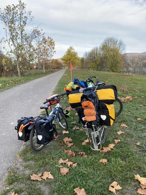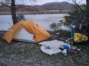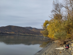 Nous voyons également que les villages sont de plus en plus touristiques. Des bateaux font la navette entre les différentes pontons parsemant le fleuve. Juste avant Nagymaros, la piste cyclable quitte la route et trace dans une large prairie arborée qui s’ouvre face au Danube. Nous dégotons un petit coin tranquille en bord de fleuve, juste à côté d’une plage paisible. Ce soir, ce sera soupe et galettes de sarrasin. Les galettes de sarrasin, c’est un peu notre doudou à nous. C’est long à faire car nous avons un petit réchaud à essence et notre poêle est petite, mais tout le monde aime ça.