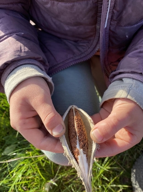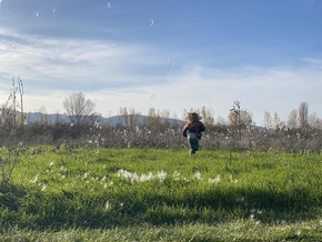 Les enfants jouent avec des graines en forme de plumes de paon et qui, en s’envolant, semblent des flocons de neige.