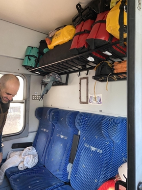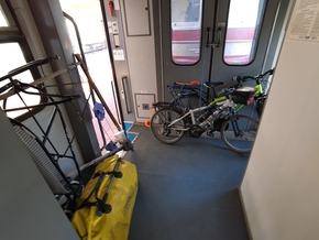 Nous voilà devant le train. Quatre vélos pleins de bagages. Les contrôleuses sont là, pas les mêmes qu’hier. Et elles ne rigolent pas. Mais pas du tout. Ça les stresse de voir tout ce bazar et de ne pas pouvoir nous comprendre. Moi, je suis plutôt très décontracté pour une fois, la réaction de la cheffe m’amuse intérieurement. Elle nous gronde à moitié, voire à trois-quarts. Elles font appel à Valentin qui nous sert de traducteur. Il nous aide à monter tous les bagages, nous prenons un compartiment complet. Les vélos sont en deux lots, un à l’avant du train, l’autre à l’arrière. Le train n’a que deux voitures, ça ira.