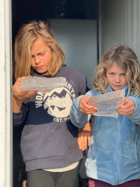 A la ferme, c’est le moment où nous devons trouver et préparer du bois pour pouvoir continuer à nous chauffer. Ici le bois est très cher et nous n’avons qu’un peu de chêne que nous devons faire durer. Alors nous récupérons les vieux bois des clôtures et barrières, des chutes chez les voisins… Les températures chutant de nouveau, nous avons parfois plus de 4 cm de glace dans les bacs d’eau des animaux. Et le ressenti de la température est parfois inférieur à -6. Heureusement les enfants le vivent sans problème !