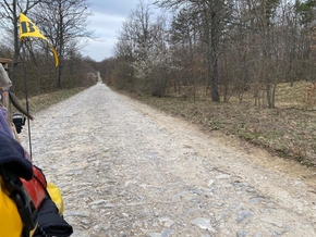 En le relevant, nous nous apercevons, déconfits, qu’une des vis du follow-me s’est rompue. Lucie va devoir rouler seule toute l’étape. Marc réussit à mettre le gros boudin sur son vélo et je récupère les 2 sacoches. Après 3 bons km les enfants veulent s’arrêter manger. Il y a de la tension dans l’air. Les craintes concernant la suite du chemin planent. Nous déjeunons.