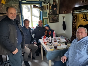 Nous finissons par nous y rendre après avoir soldé nos occupations potamiques et nous sommes accueillis par Kostas et Dimitrios qui parlent Grec et c’est tout. Ça ne les empêche pas de nous offrir à manger et à boire : “υγειά μας” (prononcer iamasse). À notre santé. Mais oui, υγειά a donné hygiène, entre autres, il y avait un esprit rude sur le upsilon si je me rappelle bien mes cours d’il y a 30 ans…