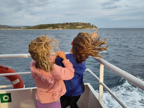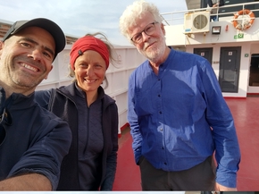 Nous voilà à nouveau sur le port. Mais nous passons cette fois par la case douane. Un coup d’œil sur nos passeports et les douaniers grecs nous laissent passer. Quelques minutes plus tard, nos vélos sont installés sur le bateau. Ça en jette ! Vient l’heure du départ, nous sommes assis dans un petit salon et voyons monter un autre cyclovoyageur. Nous allons tout de suite à sa rencontre. Georg est allemand et parle parfaitement Français. Il s’est retrouvé dans la même situation que nous, bloqué 3 jours à Μυτιλήνη. Nous avons grand plaisir à partager cette traversée avec lui et échangeons des conseils sur nos prochaines étapes réciproques.