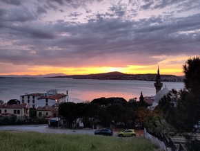 Nous voilà passés. Georg est en train de discuter avec Mourad, son contact warmshowers que nous saluons également. Quant à nous, nous nous lançons à la recherche de notre gîte réservé la veille. Ayvalik est une colline et nous allons dormir en haut. Véritable labyrinthe, la circulation n’est pas de tout repos dans ces ruelles plus ou moins cyclables et bien pentues. Bien sûr, j’ai oublié de préparer l’itinéraire complet, de noter le téléphone de notre hôte et me voilà hors Europe, la moindre utilisation de téléphone fait pousser des ailes à ma facture. Nous arrivons tout de même à notre chambre avec un certain retard.