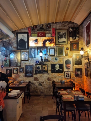 Mais tout cela prend du temps. Déjà midi. Notre petite famille mange au restaurant ce midi ! En plein bazar, une cantine comme nous les aimons. Les plats sont cuisinés, présentés, nous disons ce que nous voulons et allons nous asseoir et les assiettes arrivent sur la table. Délicieux et bon marché. Le mur du restaurant est couvert de photos de Mustafa Kemal Atatürk. Occasion idéale pour faire un peu d’histoire ! Des portraits et des sculptures d’Atatürk, il y en a partout en Turquie.