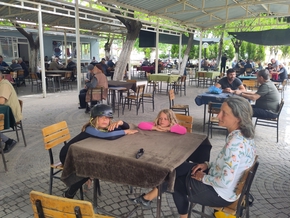 Nous arrivons à Ortaklar, nous prenons un thé à l’ombre et un repas dans une “cantine” comme nous les aimons. Un homme rentre, il nous salue en anglais, il est tout excité, d’où venons-nous, où allons-nous ? Il est enseignant dans l’école à côté et nous invite à venir dans sa classe une fois notre repas terminé. Il est lui aussi cyclo-voyageur et accueille d’autres voyageurs via warmshowers. Sa maison n’est pas sur notre route.