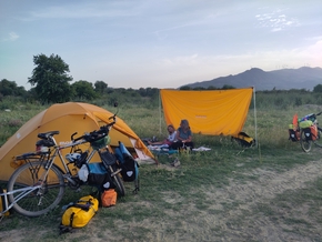 Il nous faut une pause çai (prononcer “tchaï”, le thé) après tout cela pour reposer les esgourdes. Puis nous roulons quelques kilomètres pour nous éloigner de la ville et trouver un lieu en rase campagne pour poser notre tente au milieu des champs. Un peu de silence nous fait le plus grand bien.