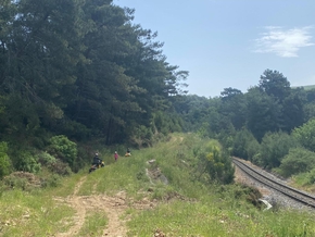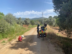 Une bifurcation par une petite route de campagne nous fait éviter une deuxième côte. Par ailleurs, elle est magnifique et serpente entre les oliviers. Elle rejoint la route plus loin en contournant la colline. J’hésite à rejoindre la route ou à continuer les routes secondaires… Allez, on poursuit l’itinéraire bis. Très vite, la route se transforme en chemin, ça descend raide. Puis nous devons longer la voie ferrée, le chemin n’est pas du tout fait pour nous. Je commence à regretter de ne pas avoir rejoint la route. Puis nous nous enfonçons dans un cul de sac et devons faire demi-tour après avoir progressé péniblement dans les herbes hautes.