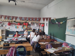 Nous allons dans la classe de Ayhan. Nous arrivons au moment du cours de glace. Les élèves sont attroupés autour de lui, il a deux bacs de glace, les enfants ont les cornets et chacun reçoit sa glace qu’il déguste en classe. Nous projetons quelques photos de notre voyage, échangeons avec les élèves intéressés par notre voyage, nos enfants sont accueillis par d’autres qui veulent leur montrer leur école. Tout cela se fait très naturellement et dans une ambiance sonore qui paralyse Léon et Lucie tant elle est assourdissante.