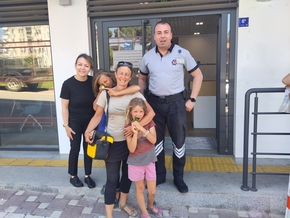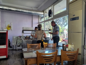 Nous posons nos vélos, en recherche d’un salon de thé. Un agent de sécurité sort d’une banque. Arme à la ceinture, Necati a les yeux écarquillés et me demande qui nous sommes, d’où nous venons avec un visage émerveillé. Nous voulons boire un thé et faire quelques courses. Non, avant, nous devez manger quelque chose, je veux vous offrir à manger ! Les enfants sautent de joie et nous voilà dans la cantine toute proche à manger un morceau offert par un homme en arme qui nous attend dans la banque à côté pour nous offrir le thé. Necati et sa collègue Sevgi nous accueillent dans la banque, nous offrent le café, parlent avec nous. Necati nous montre les photos de sa famille, de son exploitation d’agrumes, d’olives, de figues. Comme beaucoup de Turcs, il a un emploi en plus de son activité principale.