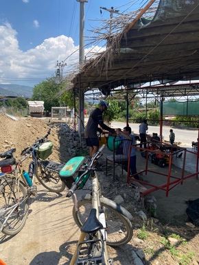En effet, le chemin est barré et impossible de continuer, l’obstacle est trop grand et le chemin éventré. Mais le petit café en contrebas est accessible par quelques marches et nous pourrions passer. Les clients et le propriétaire se lèvent sans poser de question et nous aident à porter vélos et bagages. Une occasion rêvée pour boire un çai, bien sûr.