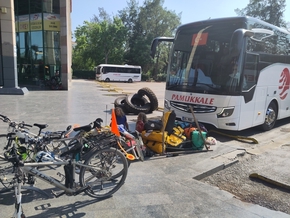 La compagnie Pamukkale nous a été recommandée par Osman. Le bus est grand et tous les vélos y entrent ainsi que nos très nombreuses sacoches ! C’est parti pour quelques heures de bus vers Antalya. Le paysage change vite, c’est bien montagneux (raison pour laquelle nous avons choisi ce moyen de transport).