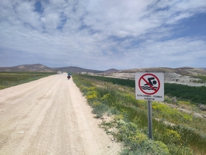 Nous avançons lentement dans les chemins de terre entre les champs irrigués. Nous suivons le canal d’irrigation et ses panneaux interdisant la baignade. Nous n’aurions pas tenté l’aventure, même sans ce panneau. Le paysage est grignoté par les carrières de pierres. Elles me font voir différemment le travertin turc que nous avons mis dans notre jolie maison française. Une voiture s’arrête. Erdoğan nous invite à boire le thé et le café, c’est sur une route parallèle à la nôtre, nous le suivons.