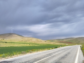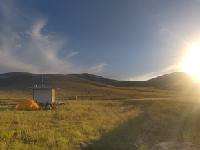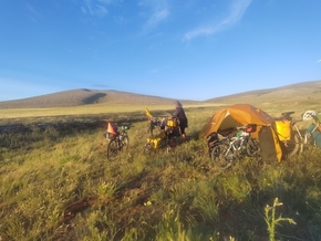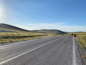 Nous reprenons notre itinéraire et nous glissons au pied des superbes collines qui vont accueillir notre tente cette nuit. Nos lourds vélos évoluent dans cette côte, le paysage est magnifique, les monts recouverts d’herbe rase et peuplés de sousliks, sorte de petites marmottes ou écureuils terrestres qui se dressent sur leur pattes arrières comme des sentinelles et sifflent pour annoncer le danger. La lumière du soir recouvre tout cela d’un voile de plénitude. Nous posons la tente tout à côté une microscopique mosquée et d’une source qui goutte à goutte. Les éoliennes qui nous dominent bercent notre nuit très reposante.