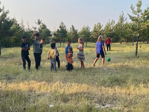 Une fois la tente plantée, nous allons faire leur connaissance et leur apportons un peu de nourriture. La bande d’enfants sert de guide dans le village de tentes où les femmes préparent le repas du soir. Ils viennent du sud-est de la Turquie et passent 6 mois ici, juste à côté de la source que nous avions repérée.