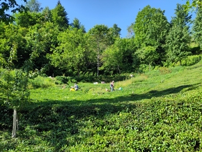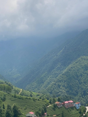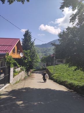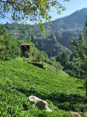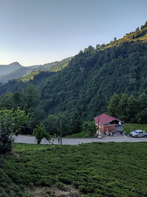 Hassan et son petit-fils nous laissent le chalet, ils redescendent, nous dormons ici. La balade matinale du lendemain dans le village nous permet d’observer la culture du thé. Les pentes dans lesquelles sont cultivés les plants de thé peuvent faire pâlir les vignerons du beaujolais qui sont pourtant déjà bien pourvus, foi de vendangeur. Les arbustes sont rasés avec une sorte de cisaille-pelle, les feuilles sont déposées dans des sacs, les sacs sont remontés et posés sur des tyroliennes et envoyés dans des camions qui descendent la vallée vers le bord de mer où les usines de fabrication se trouvent.