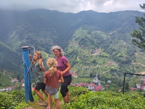 Vélos posés, nous montons dans la voiture de Hassan qui grimpe, qui grimpe. Pas fâchés de les avoir posés, les vélos. Impossible de monter jusqu’ici pour nous. Un arrêt à l’élevage de truites juste avant le village et nous voilà au chalet en plein milieu des plantations de thé. Hassan est un enfant du pays. Il connait tout le monde, tout le monde le connait. Il est l’initiateur de très nombreux événements qui font parler de la région, le premier à avoir fait du rafting sur la neige, celui qui organise le festival annuel de la baignade dans l’eau glacée, le porteur du projet de la tour du thé de Rize, etc.