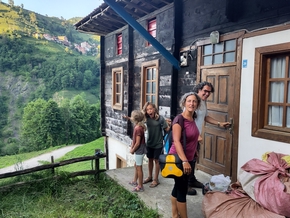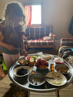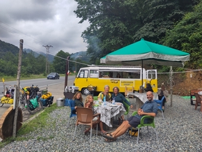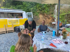 Un coup de fil de Hassan, il nous invite ce soir dans son chalet de montagne, là où il est né ! Et demain, ce sera balade avec un ami. Ami chez qui nous pouvons d’ailleurs poser les vélos. Nous n’hésitons pas, nous roulons jusqu’à chez son ami. Juste en face de chez lui se trouve un ancien bus transformé en cuisine, nous nous y posons pour boire un thé et faire le temps d’études.