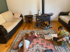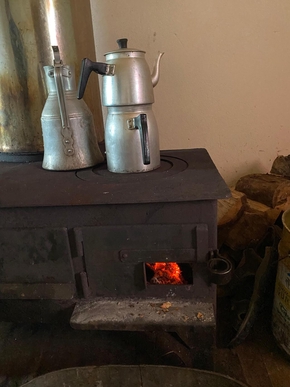 Nous sommes montés avec son petit-fils et nous passons une soirée délicieuse à cuisiner sur le poêle à bois le riz pilaf et le poisson. Simplement exquis.