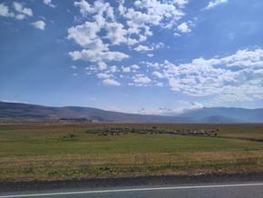 Nous posons la tente juste après Աշոցք (Ashotsk). En contrebas de la route, il y a une source, un abris et le bruit de la route est étonnamment faible malgré sa proximité.