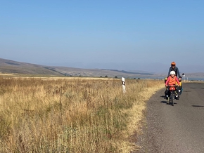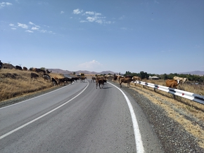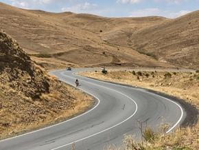 Nous croisons un skieur sur roulettes, il nous dépasse. Nous croisons ensuite un photographe qui nous prend en photo et nous filme alors que nous faisons une pause en haut d’une belle côte entre 5% et 8%. Une autre voiture s’arrête, c’est Artush. Il parle Français ! Alors il pose des questions et traduit au photographe qui est sidéré.