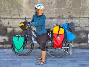Nous en profitons donc pour changer tout notre chargement, réorganiser les sacoches, mettre la remorque sur mon vélo, le follow-me (on ne sait jamais) sur le vélo d’Estelle, la tente dans la sacoche jaune, la cuisine dans la sacoche rouge, mais ça déborde alors on va en mettre aussi un peu dans la sacoche verte, bref, grand chambardement.