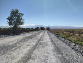 Quittant Գյումրի (Gyumri), nous empruntons une route secondaire, nous espérons qu’elle sera tranquille. Tranquille, elle l’est car elle est en cours de rénovation. Chemin caillouteux plus ou moins bien tassé, ornières, terre et poussière, exactement ce que Lucie déteste comme route, parfait pour découvrir son nouveau vélo ! Fort heureusement, la route en rejoint une autre, terminée celle-ci. Le temps est splendide. Face à nous le mont Aragats qui culmine à plus de 4000m. Arrivant du nord, nous allons contourner le massif par l’est.